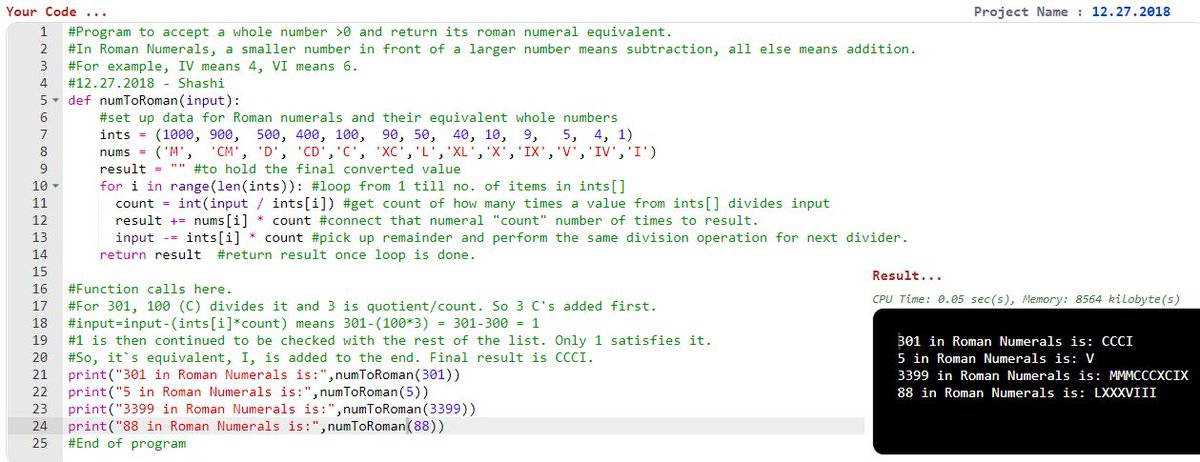 Shashi Krishna Pa Twitter Daily Code Challenge 12 27 2018 Program To Take A Number And Convert It To A Roman Numeral So 301 Becomes Ccci Python Solution With Explanation On Approach